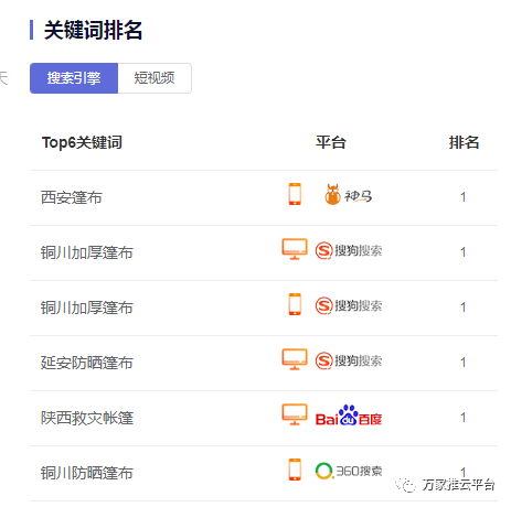 >>>分類信息:寶雞戶外救災帳篷、渭南篷布等關鍵詞均在百度、360等搜索引擎平臺首頁展現。